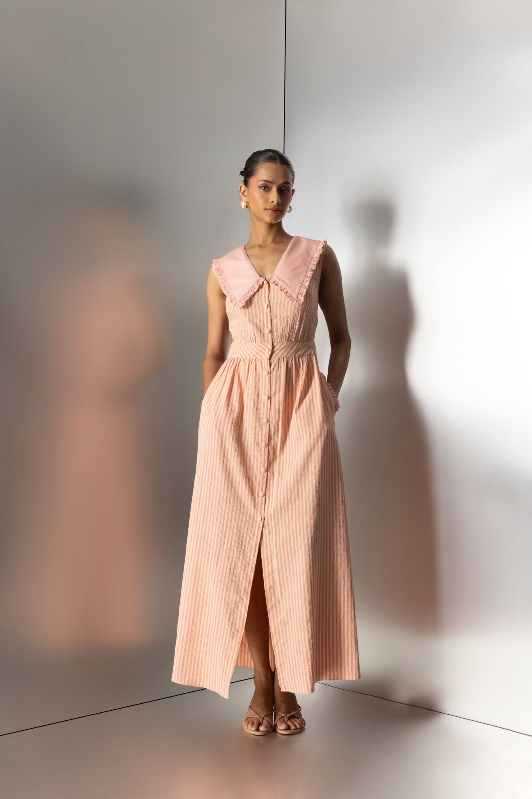 Step into a world of soft elegance with Fruity Fridays, a dress that blends vintage charm with modern grace. This striped maxi dress in a delicate peach hue is a dreamy pick for leisurely Fridays filled with brunches, bookshop visits, and sunset strolls. The statement Peter Pan collar with ruffle details adds a playful yet sophisticated touch, while the fitted waistline enhances your silhouette before cascading into a flowing skirt. Functional button-down detailing and hidden side pockets make this dress as practical as it is pretty. Whether styled with strappy heels or comfy flats, Fruity Fridays promises effortless chic with a touch of nostalgia.