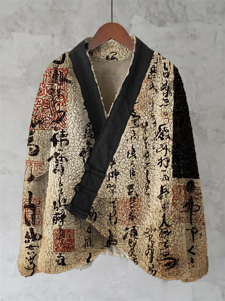 Japanese Ancient Calligraphy Cozy Fleece Kimono Cardigan