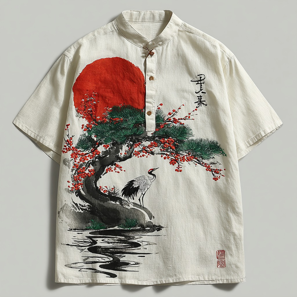 Japanese Pine And Crane Embroidered Button-down Linen Shirt