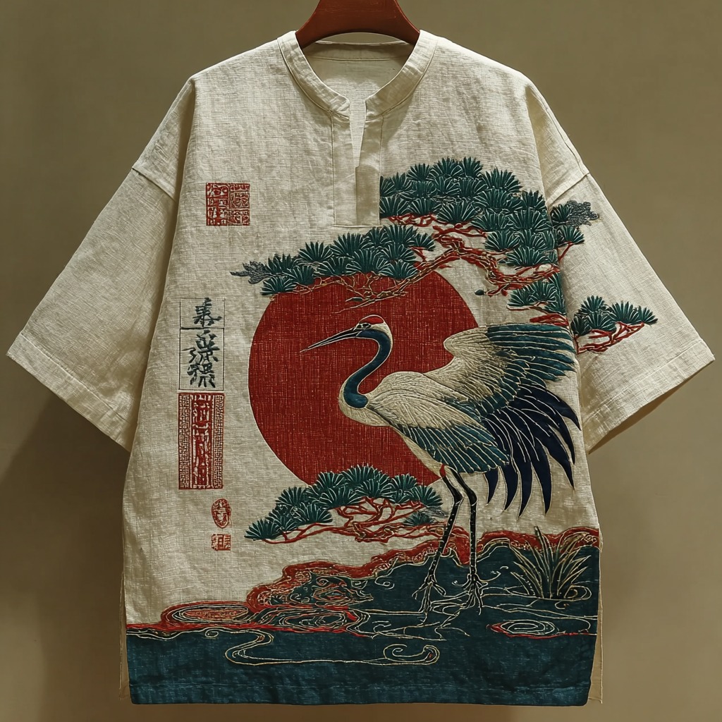 Japanese Pine And Crane Embroidered V-neck Linen Shirt