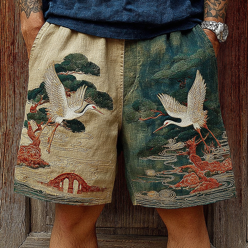 Japanese Pine And Crane Embroidery Art Contrast Color Linen Blend Casual Shorts