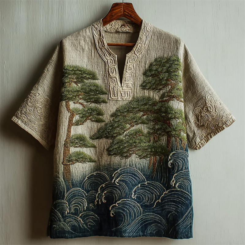 Japanese Pine Tree & Sea Waves Contrast Gradient Linen Shirt