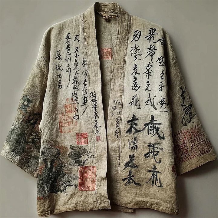 Japanese Pine Tress Calligraphy Art Embroidered Linen Kimono Cardigan