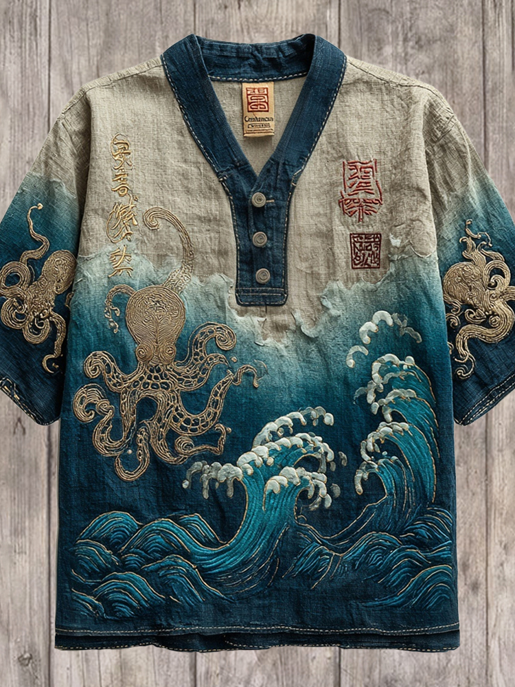 Japanese Wave & Octopus Vintage Art Men's Linen V-neck Shirt