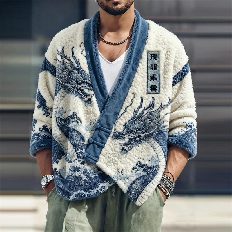 Men‘s Japanese Dragon & Sea Waves Embroidered Cozy Fleece Kimono Cardigan