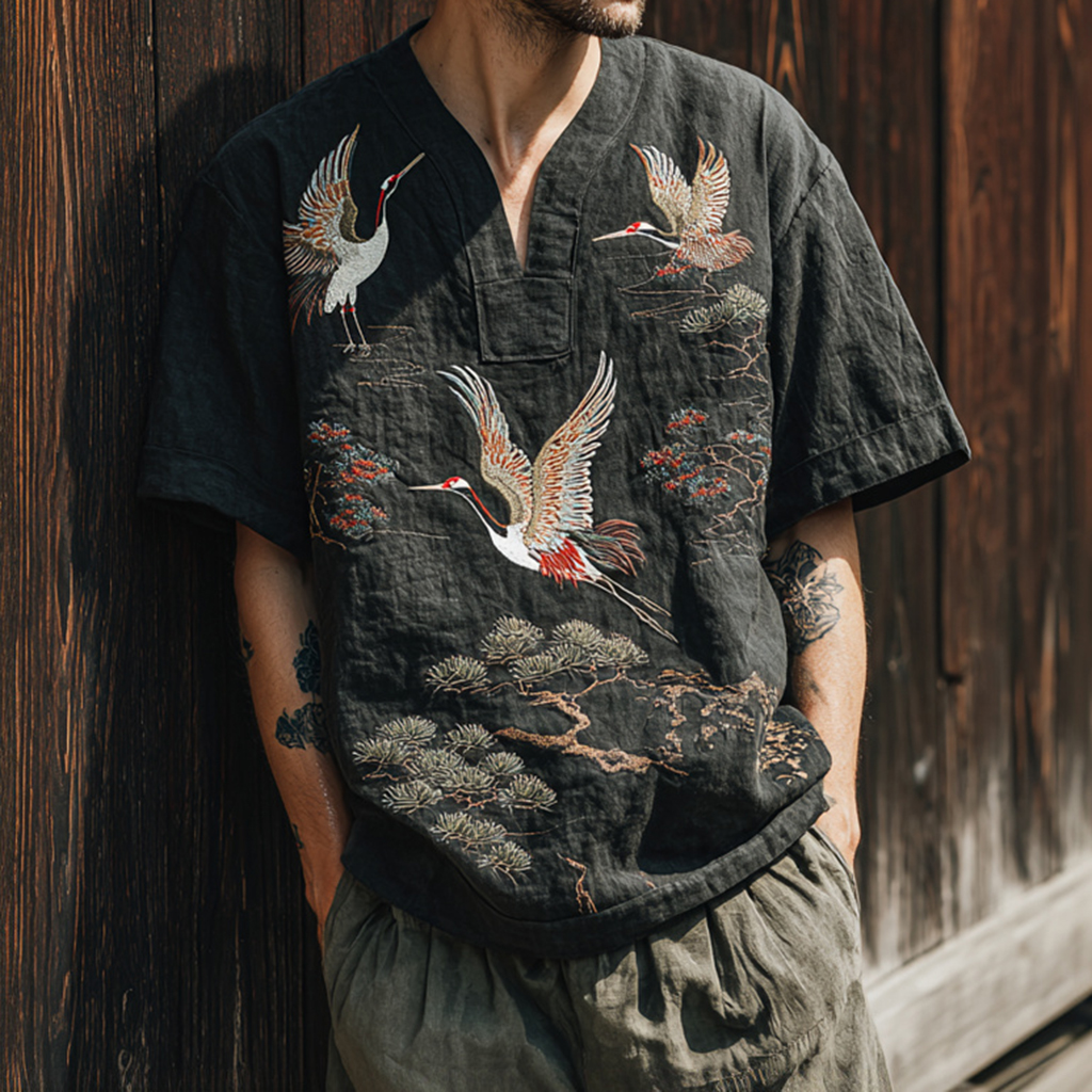 Men's Japanese Art Pine And Crane Embroidery Linen Blend Shirt