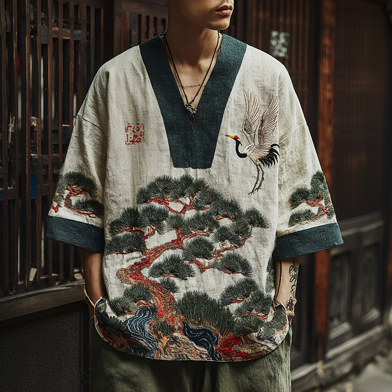 Men's Japanese Art Pine Crane Embroidery V-neck Linen Blend T-shirt