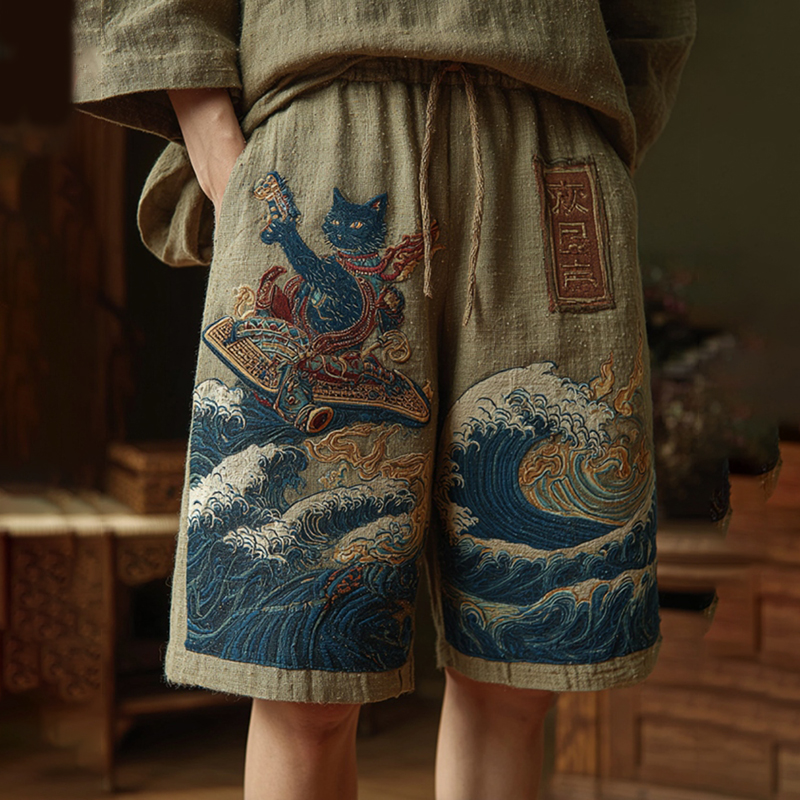 Men's Japanese Cat And Wave Art Print Casual Shorts