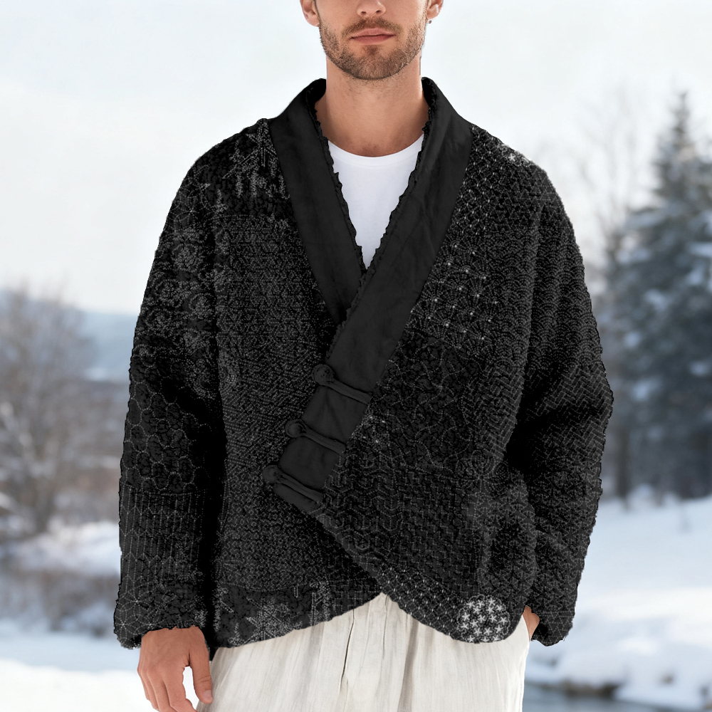 Men's Japanese Traditional Sashiko Art Cozy Fleece Kimono Cardigan