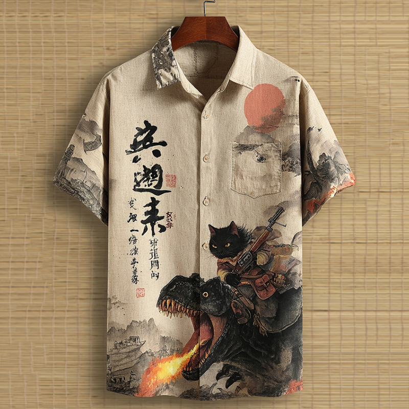 Men's Retro Calligraphy Cat Dinosaur Printed Short Sleeve Shirt