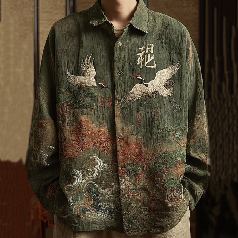 Men's Vintage Japanese Crane And Pine Trees Art Casual Shirt