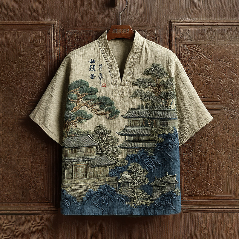 Men's Vintage Japanese Landscape Embroidery Casual V Neck Shirt