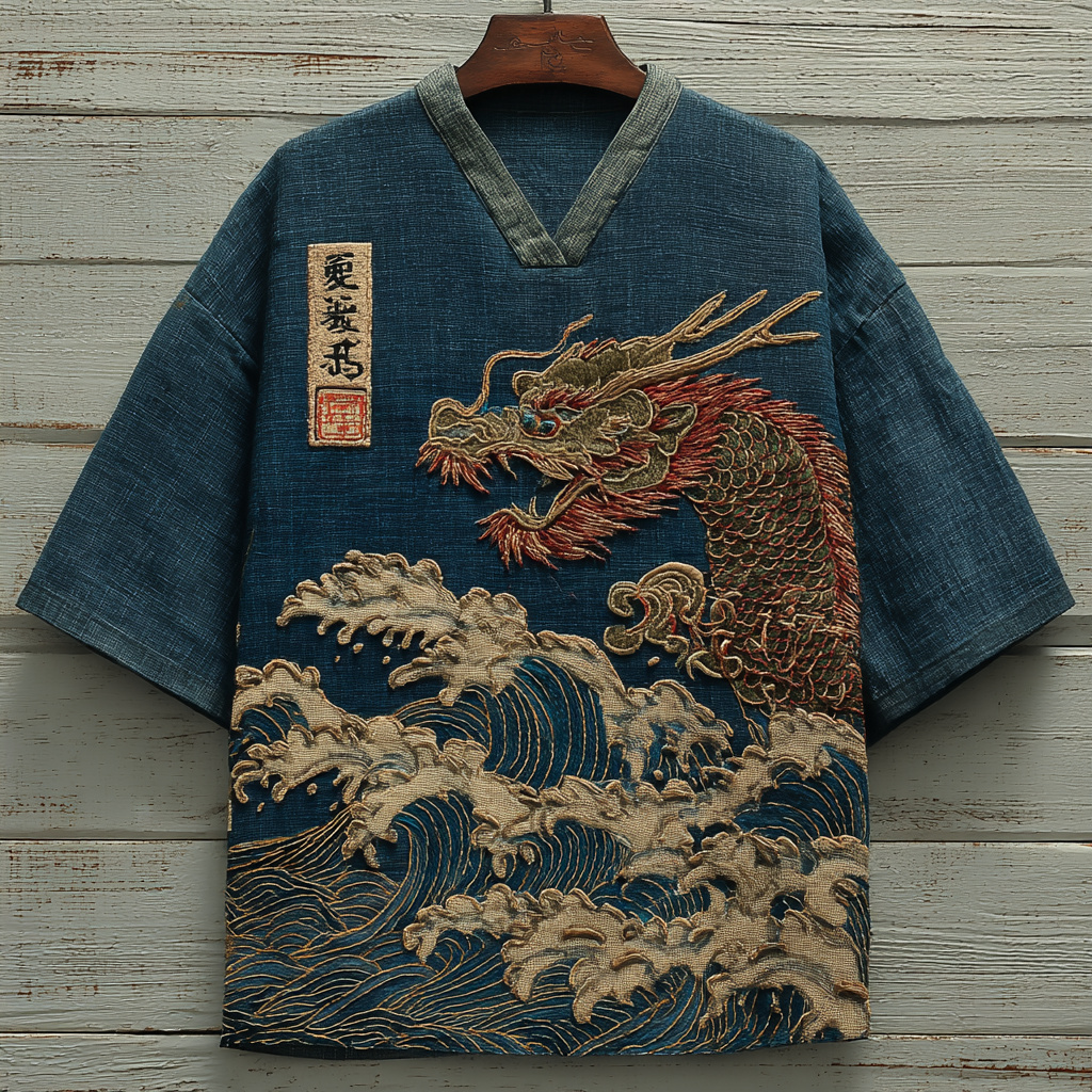 Men's Vintage Japanese Wave Dragon Art Embroidery V-neck Short Sleeve T-shirt