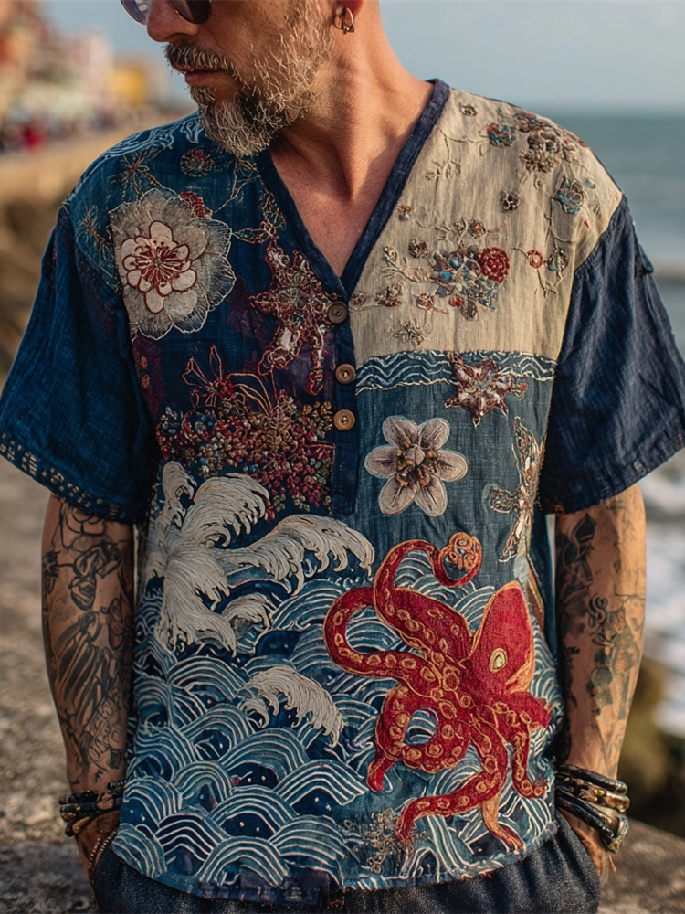 Vintage Japanese Ocean Patchwork Embroidery Men's Linen V-neck Shirt