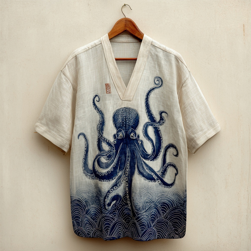 Vintage Japanese Octopus Linocut Art Linen Shirt