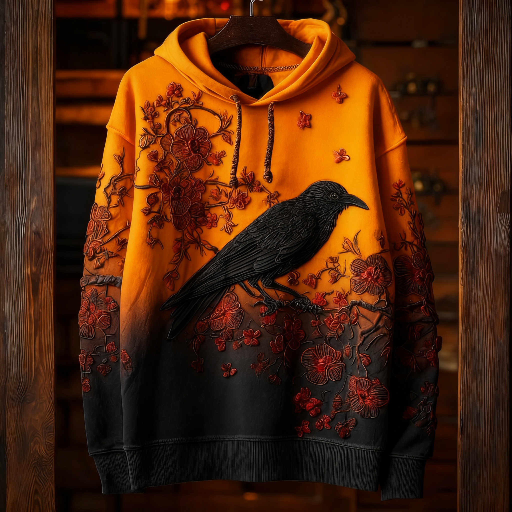 Vintage Raven & Cherry Blossom Embroidered Washed Hoodie